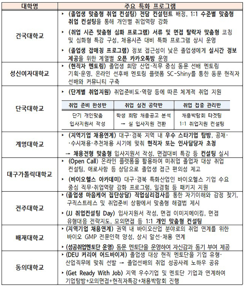또한 졸업생에 대한 수요조사를 토대로 졸업생이 원하는 프로그램을 기획해 제공받을 수 있도록 지원하고, 지역 기업의 구인수요·채용계획에 기반한 채용연계 프로그램도 제공한다.