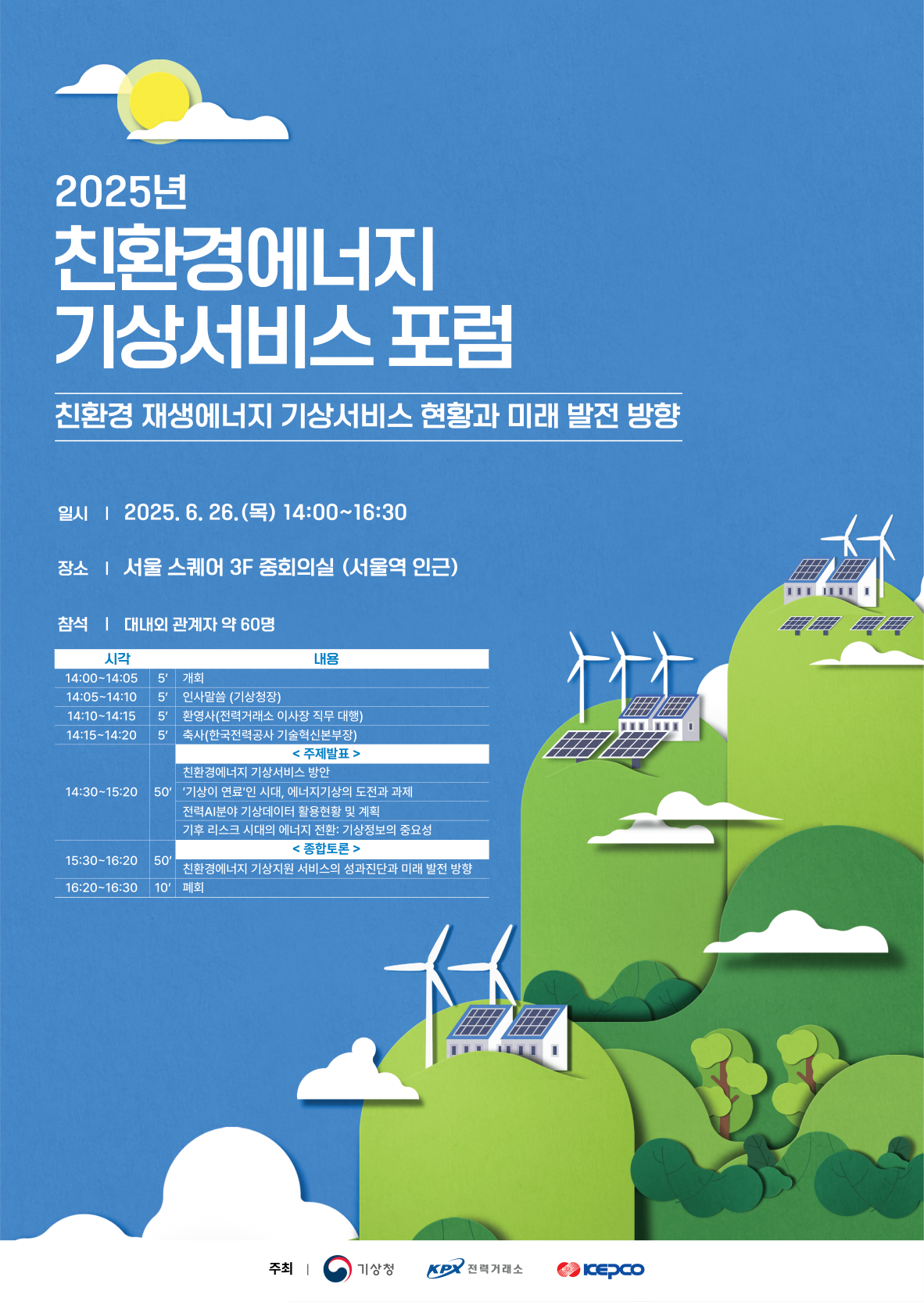 기상청(청장 장동언)은 전력거래소(이사장 직무대행 김홍근), 한국전력공사(사장 김동철)와 6월 26일 ‘2025년 친환경에너지 기상서비스 포럼’을 개최하여 공공분야 기상융합서비스의 가치를 확산하고 친환경에너지 기상서비스를 위한 협업을 강화하기로 하였다.
